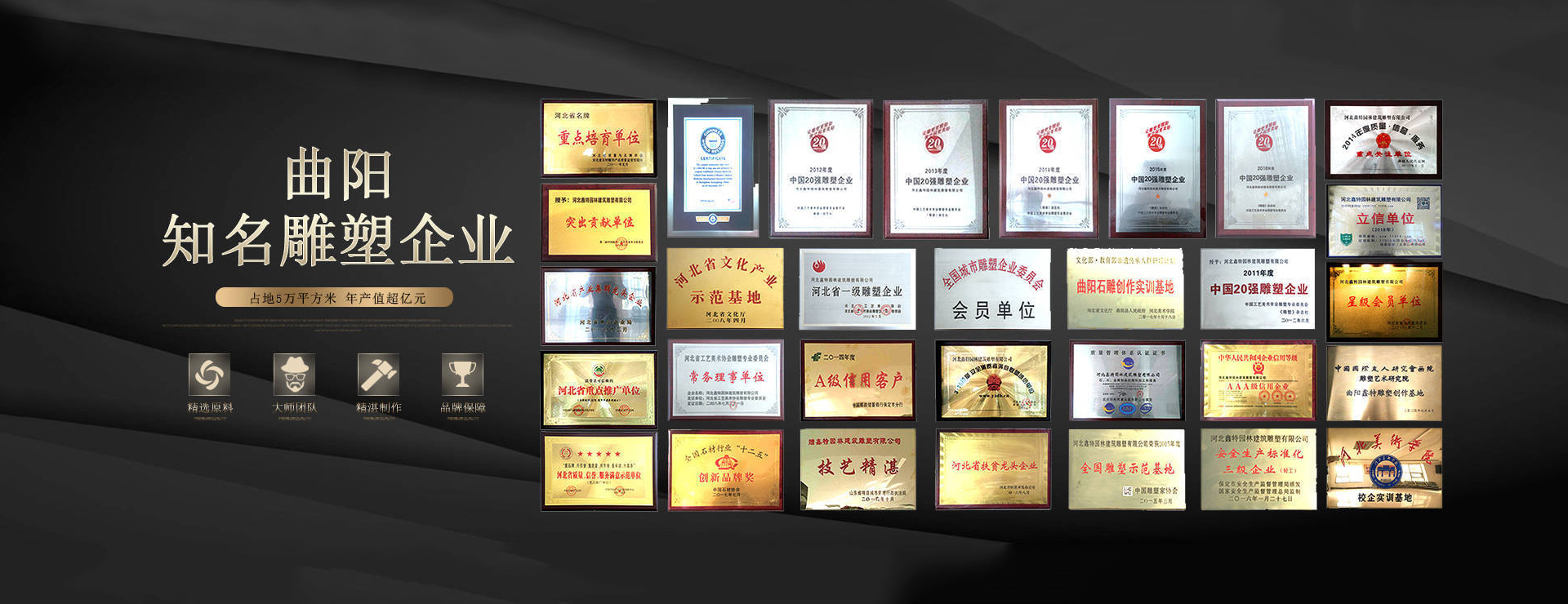 河北鑫特園林建筑雕塑有限公司成立于2002年,是中國雕刻之鄉——曲陽縣的一家實力雄厚的大型雕塑公司,公司占地面積50000+平方米,年產值超過億元,具有雕塑總承包一級資質、古建筑三級資質、市政公用工程施工總承包三級資質。